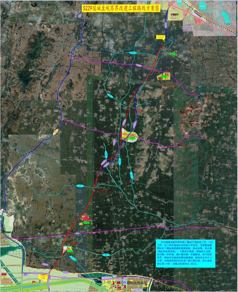 S229宿城至皖蘇界改建工程起于宿城北三環(huán),與北三環(huán)、東三環(huán)及S304形成十字交叉,沿老路走廊帶向北下穿泗許高速和宿淮鐵路,經(jīng)永安鎮(zhèn)、灰古鎮(zhèn)(鎮(zhèn)區(qū)均向西改線)、下穿京滬鐵路,繼續(xù)向北沿奎河西側(cè)(欄桿鎮(zhèn)、褚蘭鎮(zhèn)西側(cè))開(kāi)辟新線,終于皖蘇交界,接徐州市規(guī)劃徐賈快速通道。采取雙向四車道一級(jí)公路建設(shè)標(biāo)準(zhǔn),路線全長(zhǎng)約49.5公里。項(xiàng)目總投資約33.2億元,計(jì)劃2024年初開(kāi)工,2025年底完工。